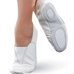 • White Pakistani leather rhythmic gymnastics shoe, featuring suede sole with rubber inserts for grip.